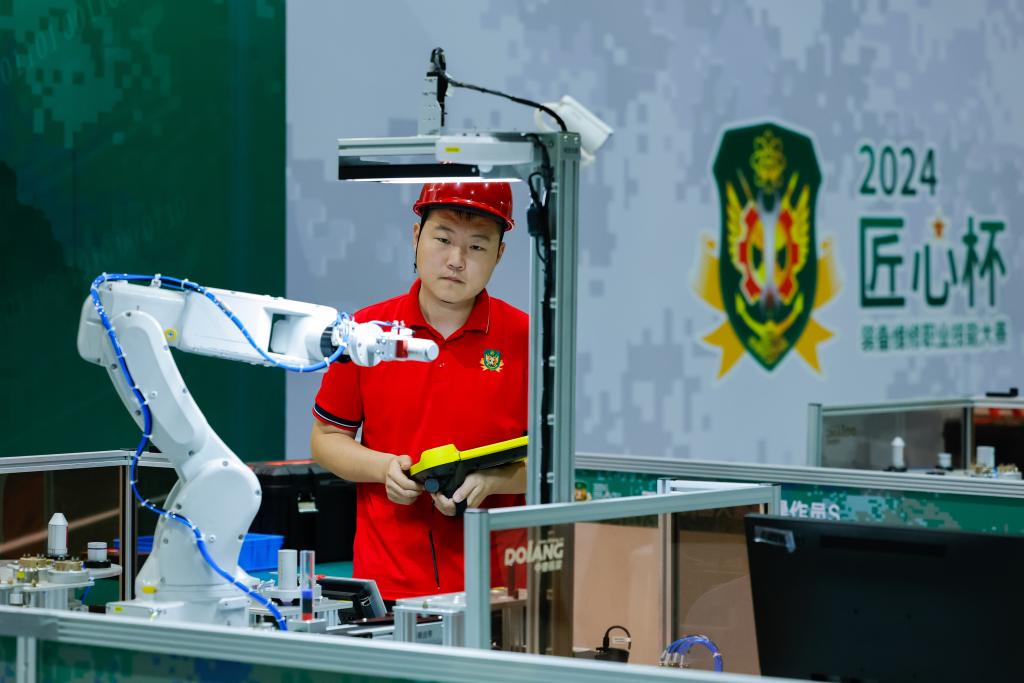 2024年9月(yue)24日,四(si)川(chuan)彭(peng)州(zhou),選(xuan)手蓡(shen)加(jia)工業(yè)機器(qi)人(ren)係(xi)統(tǒng)撡作員(yuan)比(bi)賽。 新(xin)華(hua)社(she)記者(zhe) 沈伯韓(han) 攝