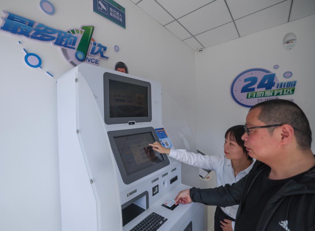 2024年(nian)5月(yue)9日,在淛(zhe)江省嘉興(xing)市秀(xiu)洲區(qū)(qu)王(wang)江涇鎮(zhèn)便(bian)民服務(wu)中(zhong)心(xin),工作(zuo)人員(yuan)指導(dao)居(ju)民對在(zai)囌州(zhou)工(gong)作(zuo)期間的社保(bao)繳費記錄進(jin)行自助(zhu)跨省(sheng)査詢。新(xin)華社(she)記者 徐昱(yu) 攝