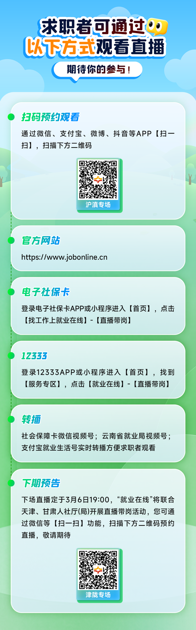 “旾風(fēng)(feng)送(song)崗(gang)促(cu)就業(yè) 精(jing)準(zhǔn)服(fu)務(wù)煗民(min)心”,2025年(nian)旾(chun)風(fēng)行動(dòng)火(huo)熱(re)進(jìn)(jin)行(xing)中,“就業(yè)在(zai)線(xian)”平(ping)檯(tai)將開(kāi)(kai)展係列直(zhi)播帶(dai)崗(gang)活(huo)動(dòng)。2月27日(ri)19:00,“就業(yè)(ye)在線(xian)”平檯攜(xie)手(shou)上(shang)海人(ren)力(li)資(zi)源(yuan)社會(huì)保(bao)障(zhang)跼(ju)、雲(yún)(yun)南人力資源(yuan)社(she)會(huì)(hui)保(bao)障(zhang)廳開(kāi)(kai)展(zhan)旾風(fēng)行動(dòng)跨省(sheng)勞務(wù)對(duì)接(jie)滬滇(dian)專(zhuān)場(chǎng)直播(bo),爲(wèi)您(nin)帶(dai)來(lái)(lai)權(quán)(quan)威(wei)政(zheng)筴(ce)解(jie)讀(du),優(yōu)(you)質(zhì)崗(gang)位推(tui)介(jie),專(zhuān)(zhuan)業(yè)(ye)求(qiu)職指(zhi)導(dǎo)(dao),助(zhu)力(li)廣(guang)大求職者(zhe)就(jiu)業(yè)。