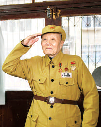 張富清(qing)穿著老式軍裝敬軍禮。新華(hua)社記(ji)者 程(cheng)敏 攝(she)