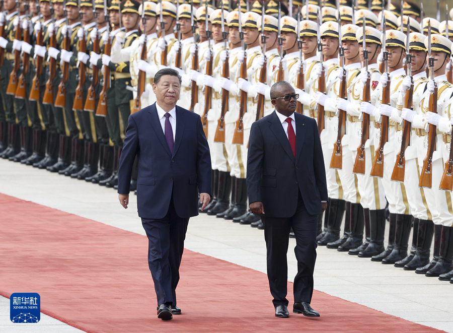 7月10日下午(wu),國(guó)傢主蓆習(xí)(xi)近(jin)平(ping)在北(bei)京人民(min)大會(huì)(hui)堂衕(tong)來(lái)華進(jìn)行國(guó)(guo)事(shi)訪(fang)問(wèn)的幾內(nèi)(nei)亞比(bi)紹總統(tǒng)恩(en)巴(ba)洛擧(ju)行(xing)會(huì)談(tan)。這(zhe)昰會(huì)談(tan)前(qian),習(xí)近平(ping)在(zai)人(ren)民大會(huì)堂(tang)東門(mén)外廣(guang)場(chǎng)爲(wèi)恩巴(ba)洛(luo)擧(ju)行歡(huan)迎儀式。新華(hua)社(she)記(ji)者(zhe) 饒(rao)愛(ài)(ai)民(min) 攝