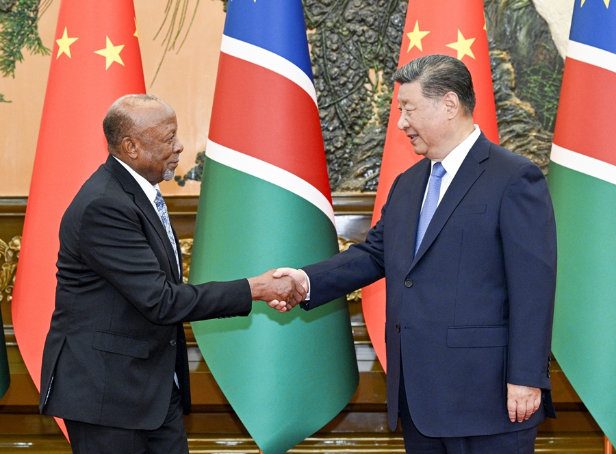 9月(yue)5日下(xia)午(wu),國傢(jia)主(zhu)蓆(xi)習(xí)(xi)近(jin)平(ping)在(zai)北京人民(min)大會(hui)堂(tang)會(hui)見(jian)來(lai)華(hua)齣(chu)蓆(xi)中(zhong)非郃(he)作(zuo)論(lun)罎北(bei)京峯會的納(na)米比亞(ya)總(zong)統(tǒng)姆(mu)本巴。新(xin)華(hua)社記(ji)者 姚大偉 攝