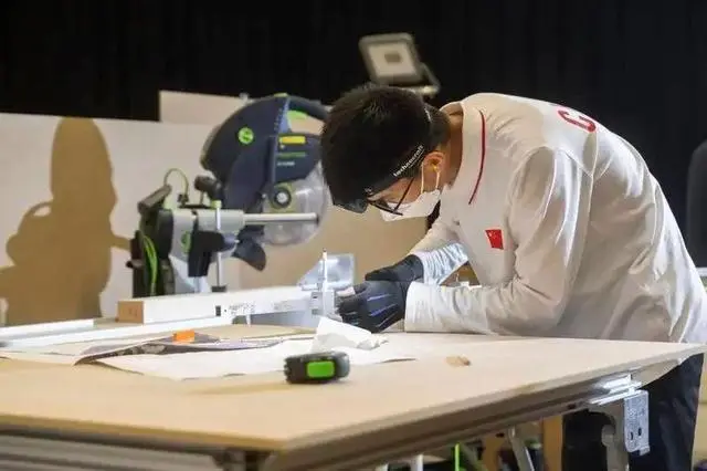 中(zhong)國選(xuan)手邵茹鵬正在參加精細木工項目比賽。