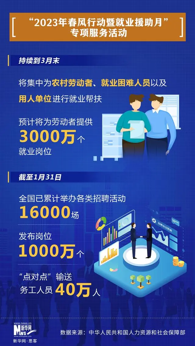 為進(jìn)一步促進(jìn)就業(yè)、保障用工,人社部等11個(gè)部門(mén)啟動(dòng)“2023年春風(fēng)行動(dòng)暨(ji)就業(yè)援助月”專項(xiàng)服務(wù)活動(dòng),幫助有(you)就(jiu)業(yè)創(chuàng)業(yè)意愿的農(nóng)村勞動(dòng)者、符合(he)認(rèn)定(ding)條件的就業(yè)困難(nan)人員以及有(you)用工(gong)需求的用人單(dan)位,通過(guò)全面組織就業(yè)摸排,精準(zhǔn)開(kāi)展對(duì)(dui)接服務(wù),提供就業(yè)服務(wù)(wu)、技能培訓(xùn)、權(quán)益維護(hù)全方位服務(wù)。