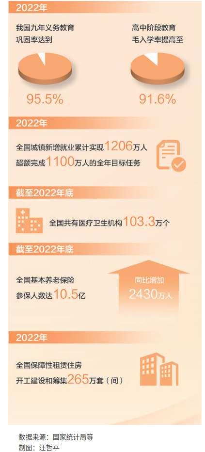 社會(huì)保障是保障和改善民生、維(wei)護(hù)社會(huì)公平、增(zeng)進(jìn)(jin)人民(min)福(fu)祉的基本制度保障(zhang)。截至2022年底,全國基本養(yǎng)老保險(xiǎn)參保人數(shù)達(dá)10.5億,同比增(zeng)加2430萬人。2022年共為2687萬困難群體代繳城鄉(xiāng)居民養(yǎng)老保險(xiǎn)費(fèi),參保率超過99%。截至2022年末,全國共有醫(yī)療衛(wèi)生機(jī)構(gòu)103.3萬個(gè)。今年政府工(gong)作報(bào)告提出,推動(dòng)優(yōu)質(zhì)醫(yī)療資源擴(kuò)容下沉和區(qū)域均衡布局。