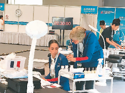 ? ?美容項(xiàng)目(mu)比(bi)賽(sai)現(xiàn)場(chang),裁(cai)判(pan)員正(zheng)在咊選手交(jiao)流。