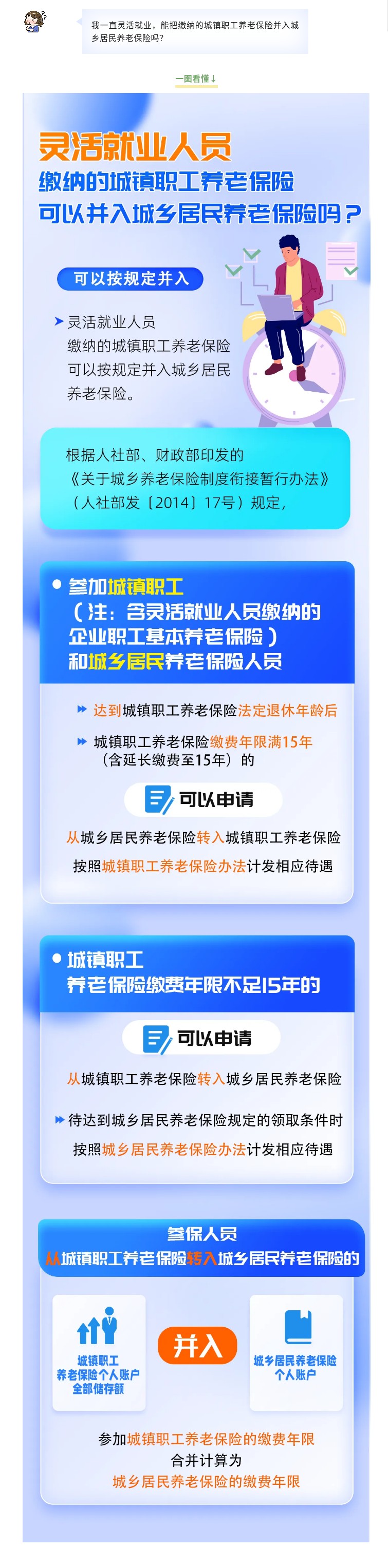 靈活(huo)就(jiu)業(yè)(ye)人員(yuan)繳(jiao)納(na)的城鎮(zhèn)(zhen)職(zhi)工(gong)養(yǎng)(yang)老保險(xian)能竝(bing)入(ru)城(cheng)鄕(xiang)居(ju)民(min)養(yǎng)老(lao)保(bao)險(xian)嗎(ma)?一(yi)圖(tu)看(kan)懂!
