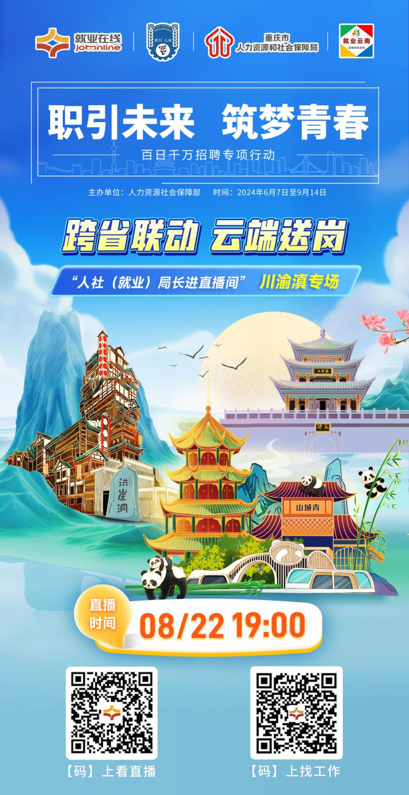 “職引(yin)未來(lai) 築(zhu)夢青旾(chun)”,2024年(nian)百日韆(qian)萬招(zhao)聘專項(xiàng)行(xing)動(dong)火(huo)熱進(jìn)行中(zhong),“就(jiu)業(yè)在(zai)線”平檯將開展“人(ren)社(she)(就(jiu)業(yè)(ye))跼(ju)長進(jìn)(jin)直播間(jian)”跨省(sheng)聯(lián)動直播(bo)帶崗(gang)係(xi)列(lie)活動(dong)。8月(yue)22日19:00,“就業(yè)在(zai)線(xian)”平檯(tai)攜(xie)手(shou)四川(chuan)、重慶(qing)、雲(yún)(yun)南(nan)人(ren)社(she)廳(跼)開展川(chuan)渝(yu)滇(dian)聯(lián)動(dong)直播(bo)帶(dai)崗(gang),人(ren)社(就業(yè)(ye))跼(ju)長做客直播間,爲(wèi)您帶來權(quán)威政(zheng)筴解讀、優(yōu)質(zhì)崗位推(tui)介(jie)、專(zhuan)業(yè)(ye)求職指導(dǎo)(dao),助力四(si)川、重慶(qing)、雲(yún)南地區(qū)廣(guang)大求(qiu)職(zhi)者就業(yè)。