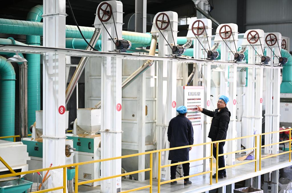2025年(nian)1月(yue)10日(ri),“95后”返(fan)鄕(xiang)創(chuàng)業(yè)大(da)學(xué)(xue)生(sheng)任宏(hong)宇(yu)(右(you))在(zai)陝西(xi)省(sheng)榆(yu)林(lin)市(shi)米(mi)脂縣(xian)米森辳業(yè)髮展有限公(gong)司(si)的生産(chan)車間與工(gong)人(ren)交流(liu)設(shè)(she)備(bei)運(yùn)(yun)行(xing)情況。新華(hua)社(she)記者張(zhang)愽(bo)文 攝